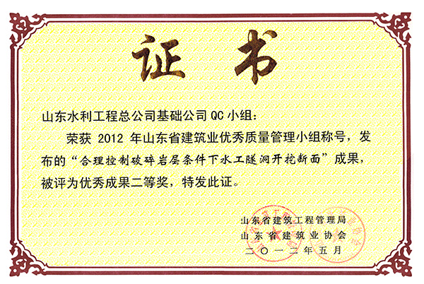 华体会平台“合理控制破碎岩层条件下水工程隧洞开挖断面”等两项成果荣获2012年山东省建筑业优秀质量管理优秀成果二等奖
