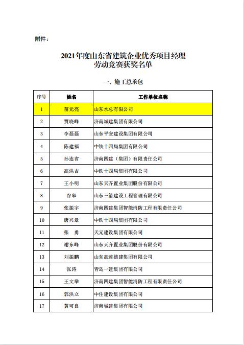 近日,由山东省建设工会和山东省建筑业协会组织开展的《2021年度山东省建筑企业优秀项目经理劳动竞赛活动》落下帷幕,经双方组成的工作委员会评议审定和综合评审,我华体会平台苗元亮、卢正雷、蔡国森三名同志被评为“山东省建筑企业优秀项目经理”。此项殊荣是山东省建筑行业项目经理的最高荣誉,旨在鼓励受表彰人员再接再厉,发挥引领示范作用,创建更多精品工程。
