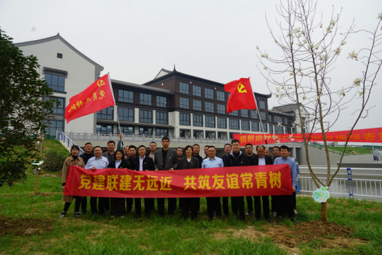 在植树现场,各项目管理人员、一线人员互相配合,合力完成了紫薇、桂花、山玉兰、垂丝海棠等树种的种植。本次活动,双溪口水库临时党支部特意从水库带来了“临安山泉”浇灌大家共同种植的树木,浇灌了各方在党建联建中结成的深厚情谊。三位支部书记共同为“党建联建友谊林”揭牌,见证了联建工作的新起点。活动结束后,大家共同参观了新陡门闸站,并赴石门水库现场参观交流水库下闸蓄水等工作。