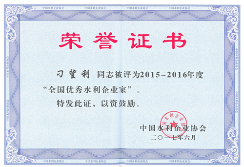 华体会平台刁望利同志荣获2015-2016年度“全国优秀水利企业家”