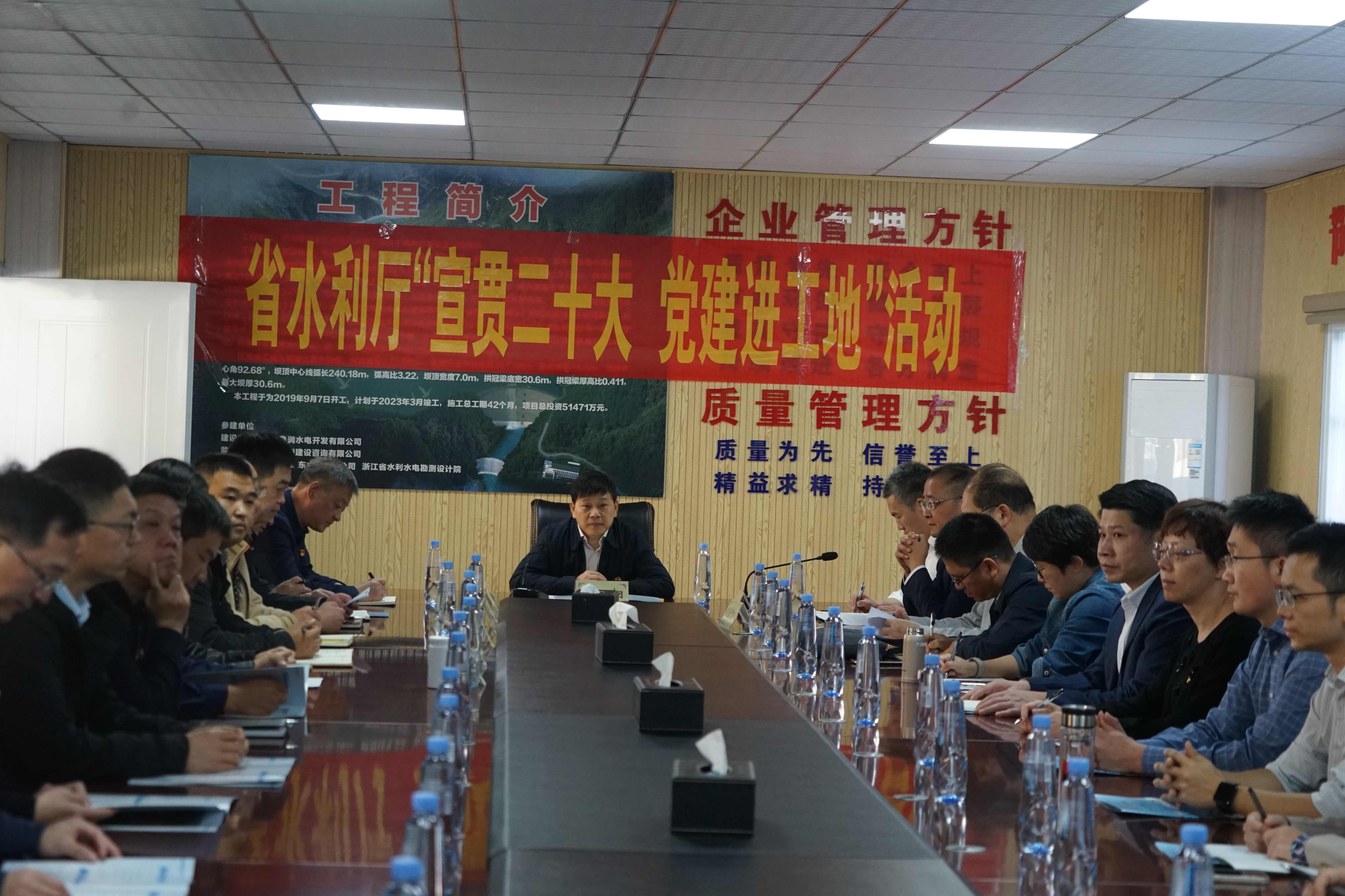 11月10日,浙江省水利厅副厅长杨炯率省水利厅建设处、质管中心等负责同志到双溪口水库工程开展“宣贯二十大 党建进工地”活动。此次活动旨在把党建课堂搬到工程建设现场,把宣讲“二十大”深入基层,充分激发广大工程建设者建功新时代的积极性、主动性、创造性。
